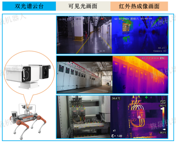 2、檢測功能:機器人配可見光攝像機、紅外熱成像儀和拾音器,可增配溫濕度等設備。能遠程控制移動、云臺轉動,拍攝圖像和熱成像,實時傳至主控室,便于判斷設備狀態。巡檢時自動記錄采集信息