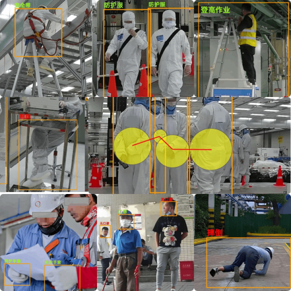 旗晟智能檢測算法基于行業大數據庫積累以及自研AI深度學習算法模型,可以對安全帶、安全帽、安全馬甲等監測、防護服、防護手套、防護面罩、口罩、護目鏡等佩戴監測、登高作業 監測、翹腿、奔跑、摔倒、趴地、坐地、人員聚眾等監測!