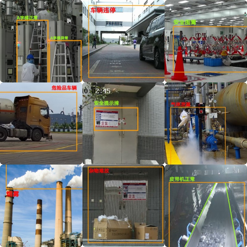 旗晟智能檢測算法基于行業大數據庫積累以及自研AI深度學習算法模型,可以對A字梯異常監測、安全門開合監測、安全提示牌監測、安全圍籬監測、危險品車輛識別、叉車/貨車/清掃車識別、車輛違停監測、窗戶開合狀態、火焰監測、漏液監測、氣體泄漏檢測、煙霧檢測、雜物堆放監測、渣土掉落監測、違規騎自行車、皮帶機異常監測
